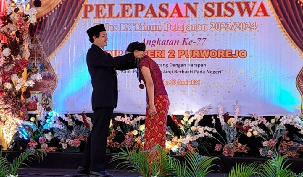 Acara pelepasan siswa SMPN 2 angkatan ke-77 berlangsung di halaman sekolah, dihadiri oleh Kadin Dikbud Wasit Diono, pengurus komite sekolah, pengurus paguyuban, serta orang tua siswa kelas 9.