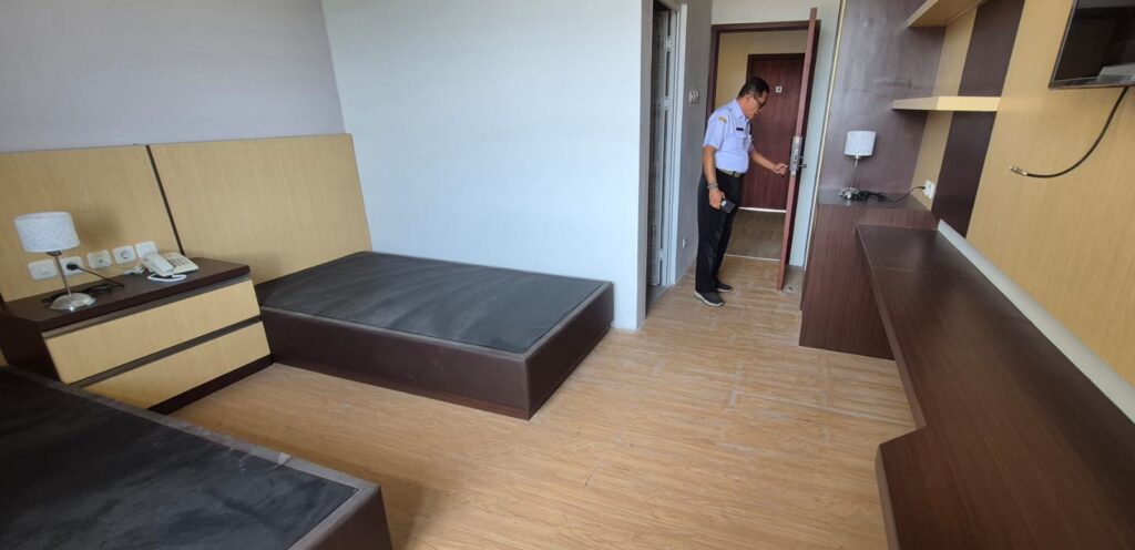Juga pengecekan beberapa bagian sesuai dengan rekomendasi dari tim sertifikasi laik fungsi (SLF), baik di dalam kamar hotel maupun ruangan lainnya. Termasuk ukuran pintu kamar untuk difabel yang disesuaikan dengan ketentuan.