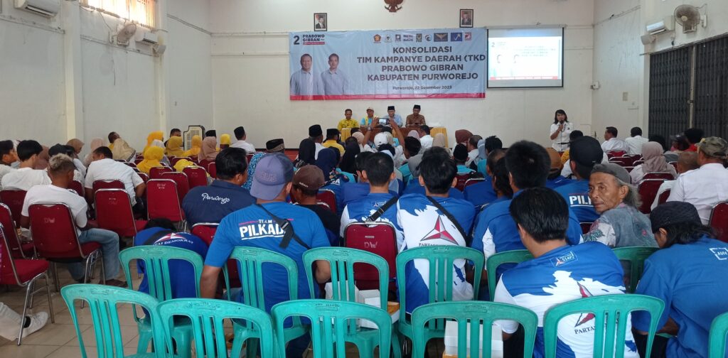 PURWOREJO, Untuk pertama kalinya Tim Kampanye Daerah (TKD) Prabowo Gibran Kabupaten Purworejo melakukan konsolidasi dengan sembilan partai pendukung Koalisi Indonesia Maju (KIM). Konsolidasi dilakukan pada Jumat (22/12) siang di Rumah Makan Dargo diikuti perwakilan partai KIM. Adapun sembilan partai koalisi yakni Gerindra, Golkar, Demokrat, PAN, PSI, PBB, Garuda, dan Gelora.