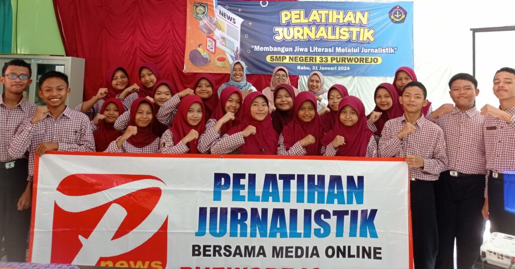BANYUURIP, Sebanyak 20 siswa SMPN 33 Purworejo mengikuti pelatihan jurnalistik. Pelatihan yang diadakan di salah satu ruang sekolah pada Rabu (31/1) itu bertema membangun jiwa literasi melalui jurnalistik. Pelatihan dilakukan bersama medis online Purworejo News. Para peserta berasal dari pengurus OSIS dan pegiat jurnalistik dari kelas 7 dan 8, terdiri atas 15 putri dan lima putra.