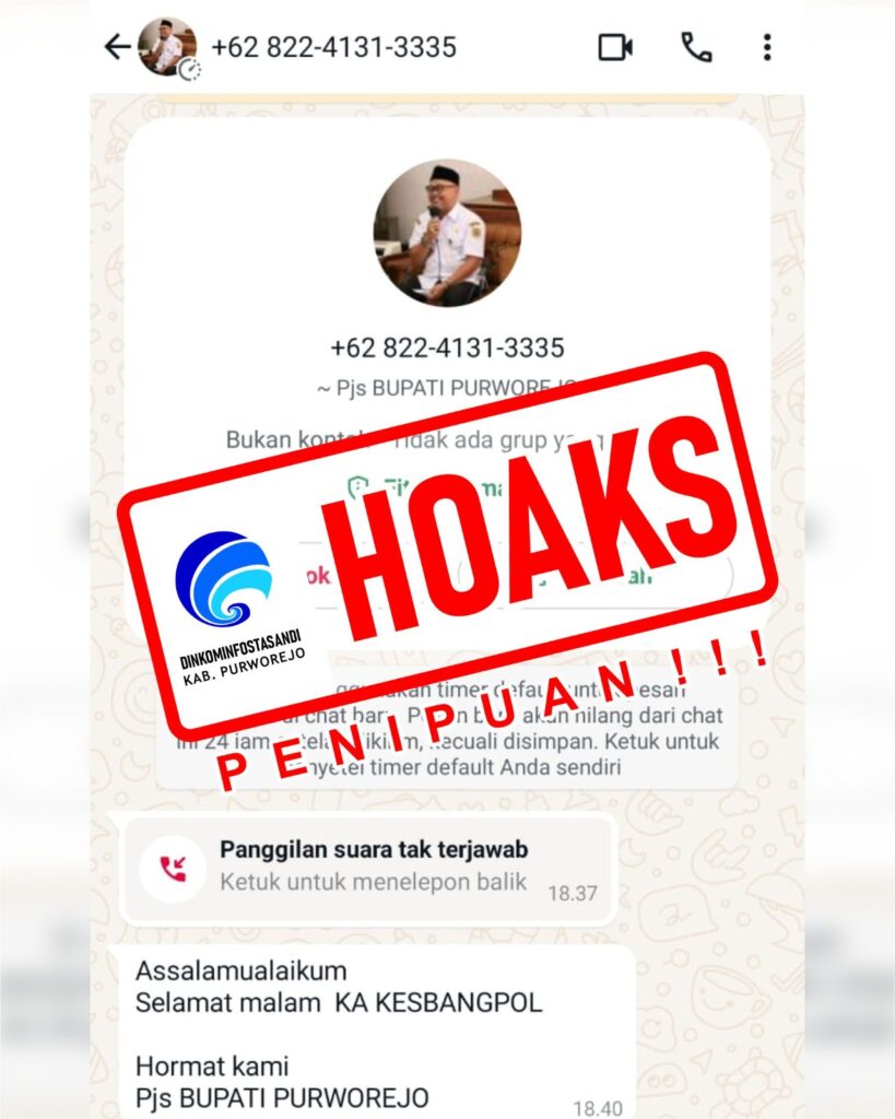 PURWOREJO, Belum genap sebulan bertugas sebagai Pjs Bupati Purworejo, nomor WhatsApp Endi Faiz Effendi dicatut pihak tak bertanggungjawab. Dengan menggunakan foto profil Pjs Bupati Endi, penipu itu mengirim pesan WhatsApp ke Kaban Kesbangpol dan banyak pihak. Faktanya, klaim yang mengatakan bahwa Pjs. Bupati Purworejo lain adalah tidak benar.
