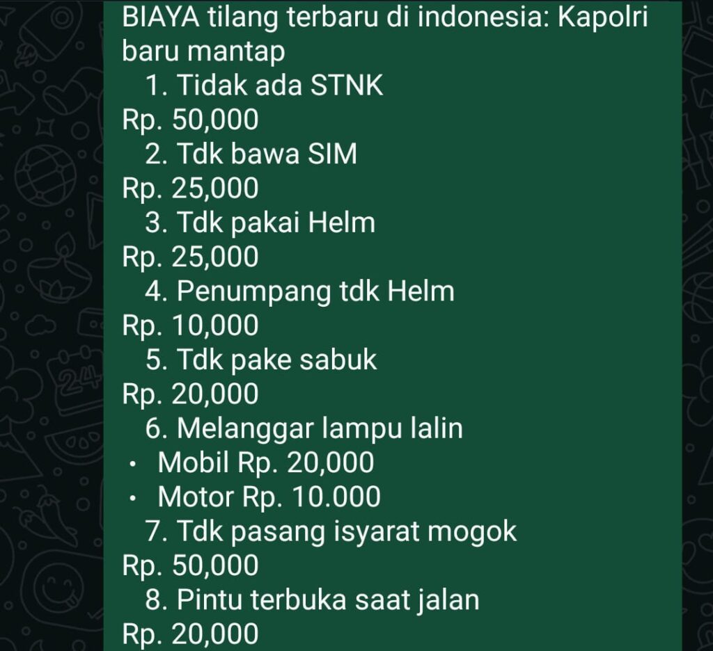 PURWOREJO, Akhir-akhir ini di grup WhatsApp kembali beredar pesan tentang Biaya Tilang terbaru di indonesia. Dalam isinya, disebutkan ada 13 jenis pelanggaran yang beserta besaran dendanya. Termasuk juga ajakan Jangan Minta Damai. Disebutkan WhatsApp itu sumbernya (dicopy) dari Mabes Polri.