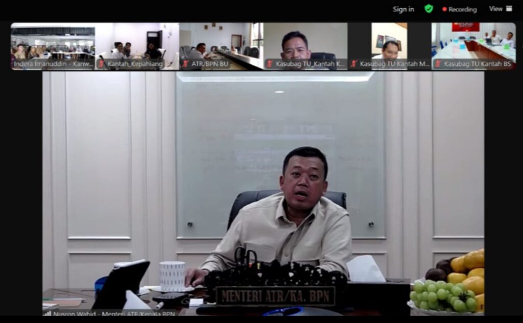 JAKARTA, Menteri Agraria dan Tata Ruang/Kepala Badan Pertanahan Nasional (ATR/BPN), Nusron Wahid memberikan pengarahan kepada jajaran Kantor Wilayah (Kanwil) BPN Provinsi Nusa Tenggara Barat (NTB) dan Bengkulu secara daring, Rabu (11/12/2024). Pesan yang ia tekankan kali ini terkait penataan sumber daya manusia (SDM) di daerah sesuai dengan beban kerja dan tingginya permintaan pelayanan dari masyarakat.