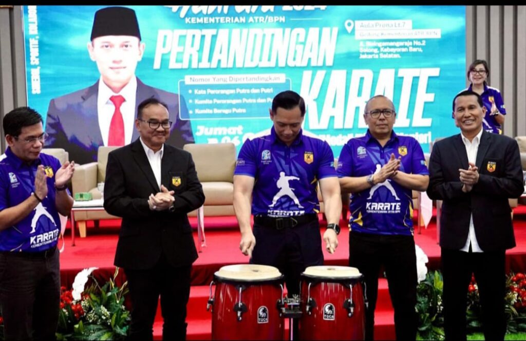 JAKARTA, Memeriahkan Hari Agraria dan Tata Ruang (Hantaru) Tahun 2024, Kementerian Agraria dan Tata Ruang/Badan Pertanahan Nasional (ATR/BPN) menyelenggarakan Pertandingan Karate di Aula Prona, Kementerian ATR/BPN, Jumat (4/9). Pertandingan dibuka Menteri ATR/Kepala BPN, Agus Harimurti Yudhoyono (AHY), ditandai dengan pemukulan perkusi.