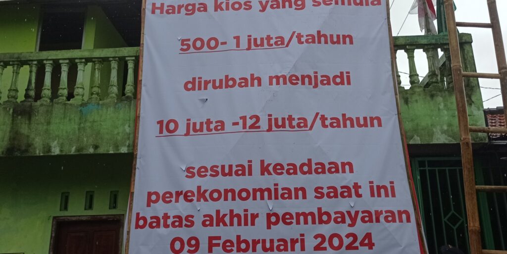 Perjanjian tersebut kemudian dibuat kembali di tahun 2023 dengan substansi yang sama terkait nominal sewa yang harus dibayarkan, hanya ditambahkan sewa kios yang menghadap ke barat Rp 500.000. Dalam surat perjanjian tahun 2023 disebutkan, pembayaran sewa dilakukan selambat-lambatnya tanggal 23 Desember 2023. Adapun kepala desa dimaksud yakni Pandu Ariyoko Putra yang kemudian mengubah aturan secara sepihak pada awal tahun 2024.