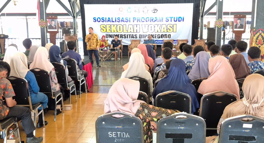 PURWOREJO, Puluhan siswa yang berasal dari perwakilan 20 SMA dan SMK yang ada di Kabupaten Purworejo mengikuti sosialisasi program studi (prodi) Sekolah Vokasi Universitas Diponegoro (Undip). Didampingi para guru, mereka mengikuti sosialisasi yang diadakan di pendopo kabupaten, Kamis (29/1/2026).
