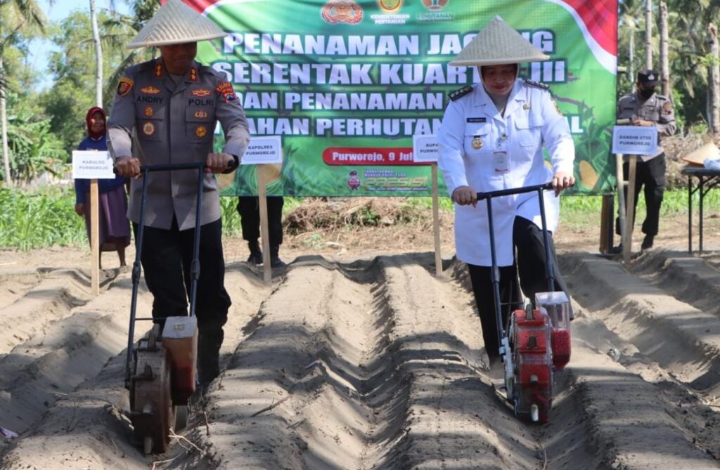 PURWOREJO, Polres Purworejo menggelar kegiatan penanaman jagung secara serentak pada kuartal III tahun 2025. Hal ini sebagai bagian dari program nasional Polri dalam mendukung ketahanan pangan. Kegiatan yang dipimpin Kapolres Purworejo, AKBP Andry Agustiano ini berlangsung pada Rabu (9/7/2025) sore dan dipusatkan di lahan seluas 5.000 meter persegi di Desa Patutrejo, Kecamatan Grabag. Bupati Yuli Hastuti turut hadir dalam kegiatan tersebut