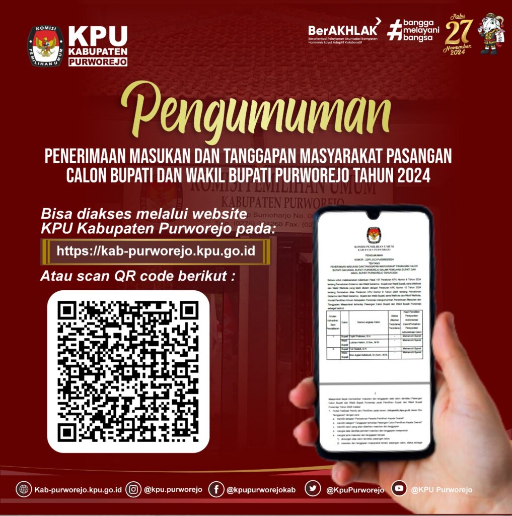 Jarot menyebutkan, masyarakat dapat menyampaikan tanggapan dan masukan secara daring dengan mengakses laman infopemilu.kpu.go.id. Selain itu, tanggapan juga dapat disampaikan secara luring di Kantor KPU Kabupaten Purworejo, Jalan Urip Sumoharjo 6 Purworejo.
