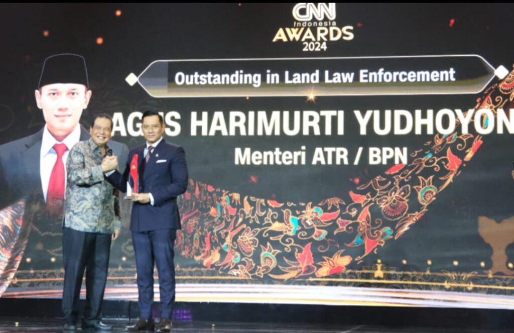 SURABAYA, Menteri Agraria dan Tata Ruang/Kepala Badan Pertanahan Nasional (ATR/BPN), Agus Harimurti Yudhoyono (AHY) menerima penghargaan atas sinergi dan kolaborasi yang dilakukan dalam pemberantasan mafia tanah bersama kepolisian, kejaksaan, dan pemerintah daerah. Penghargaan _Outstanding in Land Law Enforcement_ ia terima dalam CNN Indonesia Awards 2024, Rabu (25/9).