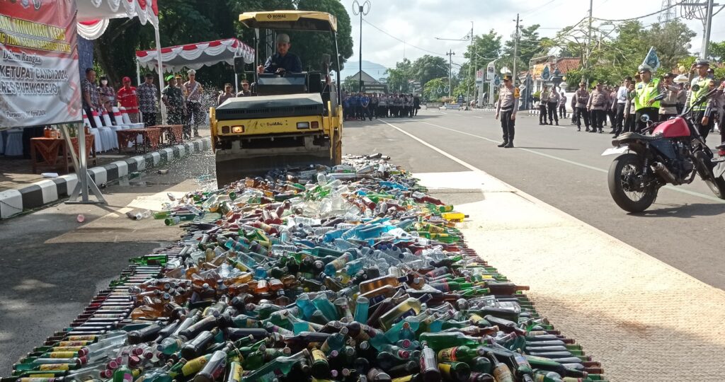3.725 botol miras dari berbagai jenis dan merk, serta 1.250 knalpot brong dimusnahkan menggunakan mesin penggilas aspal.