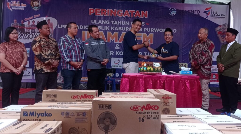 PURWOREJO, Peringatan HUT ke-55 Lembaga Penyiaran Publik Lokal (LPPL) Irama FM pada Sabtu (29/6) berlangsung meriah. Acara yang digelar di halaman kantor Radio Irama FM Jalan A. Yani Purworejo itu dibarengkan dengan pengundian hadiah dari Kopi cap Tjangkir. Dari 1.920 amplop undian, Nur Muhammad Qosim, warga Kelurahan Kledung Kradenan Kecamatan Banyuurip beruntung mendapatkan satu sepeda yang diundi di sela acara.