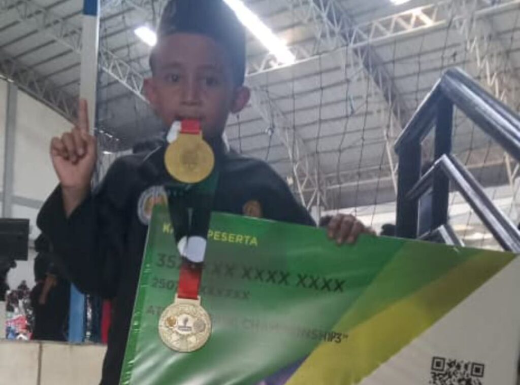 PURWOREJO, Pesilat cilik asal Desa Jati Kecamatan Bener, Faiz Saifulloh (10) kembali membuktikan kelasnya. Kali ini, melalui Kejurnas Pencak Silat Ngawi Championship III Tahun 2025, bocah kelas 4 SDN Jati Bener itu meraih dua medali emas sekaligus dalam kejurnas yang digelar dua hari, Sabtu dan Minggu (19-20/7/2025).