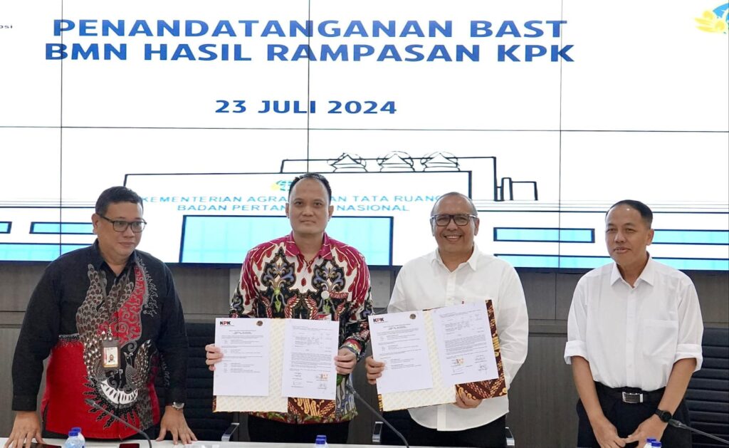JAKARTA, Kementerian Agraria dan Tata Ruang/Badan Pertanahan Nasional (ATR/BPN) menerima aset Barang Milik Negara (BMN) hasil rampasan Komisi Pemberantasan Korupsi (KPK) dengan total nilai Rp4,78 miliar. Penyerahan ditandai dengan penandatangan Berita Acara Serah Terima (BAST) oleh Sekretaris Jenderal (Sekjen) Kementerian ATR/BPN, Suyus Windayana dan Direktur Pelacakan Aset, Pengelolaan Barang Bukti, dan Eksekusi KPK, Mungki Hadipratikto pada Selasa (23/7).