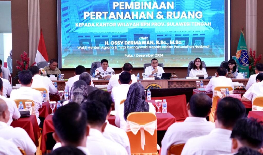 PALU, Wakil Menteri Agraria dan Tata Ruang/Wakil Kepala Badan Pertanahan Nasional (Wamen ATR/Waka BPN), Ossy Dermawan mengemukakan solusi dalam rangka percepatan layanan publik di lingkungan Kementerian ATR/BPN. Hal ini ia sampaikan ketika berkunjung ke Kantor Wilayah (Kanwil) BPN Provinsi Sulawesi Tengah (Sulteng), Kota Palu pada Rabu (4/12).
