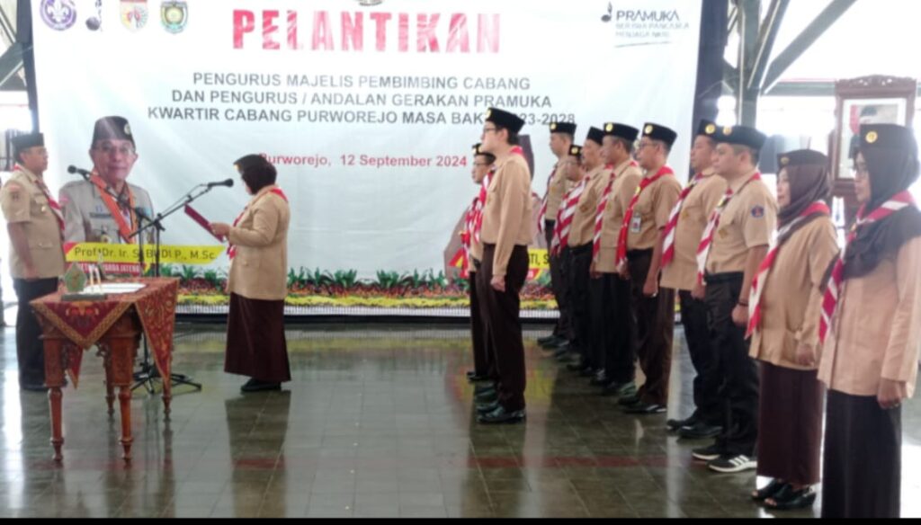 PURWOREJO, Ketua Pramuka Kwartir Daerah (Kwarda) Jawa Tengah Budi Prayitno melantik Pengurus Majelis Pembimbing Cabang (Mabicab) Purworejo di pendopo kabupaten Purworejo pada Kamis (12/9). Yuli Hastuti yang menjadi Ketua Mabicab dilantik bersama pengurus yang terdiri atas kepala dinas terkait.