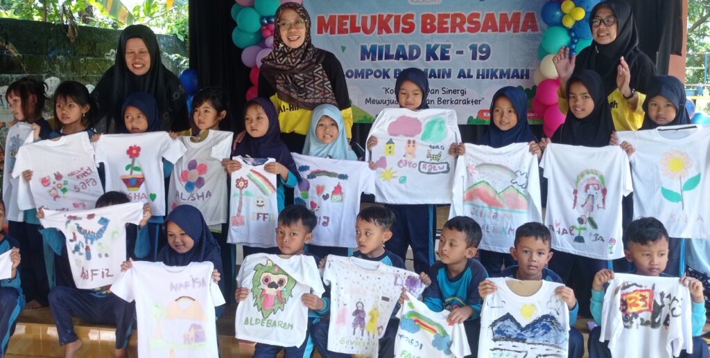 BENER, Memeriahkan milad ke19, Kelompok Bermain (KB) Al Hikmah Desa Kaliurip Kecamatan Bener mengadakan kegiatan melukis bersama untuk seluruh muridnya pada Kamis (29/2). Ke-58 murid KB pun dengan semangat melukis kaos putih yang mereka bawa didampingi orang tuanya.