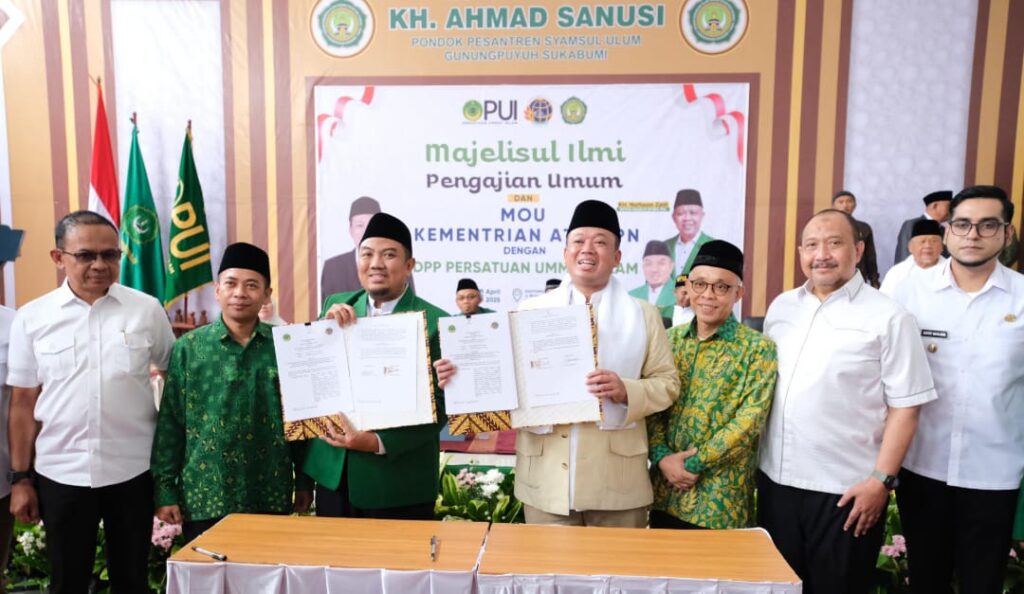SUKABUMI, Menteri Agraria dan Tata Ruang/Kepala Badan Pertanahan Nasional (ATR/BPN), Nusron Wahid, menandatangani Nota Kesepahaman (MoU) yang meresmikan kerja sama dengan Dewan Pimpinan Pusat (DPP) Persatuan Ummat Islam (PUI), di Pondok Pesantren Syamsul ‘Ulum, Kota Sukabumi, Rabu (16/4/2025). Dalam kesempatan itu, Menteri Nusron menekankan pentingnya pemanfaatan tanah secara produktif untuk kemakmuran rakyat, termasuk tanah-tanah wakaf.