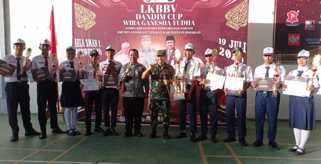 PURWOREJO, Bekerjasama dengan Kodim 0708, OSIS SMAN 1 Purworejo menggelar Lomba Kreasi Baris Berbaris dan Variasi (LKBBV) Dandim Cup “Wira Ganesha Yudha”. Lomba perdana yang diikuti 16 peserta tingkat SMP/M.Ts dari perwakilan Danramil yang ada di Kabupaten Purworejo diadakan di lapangan SMAN 1, Sabtu (19/7/2025).