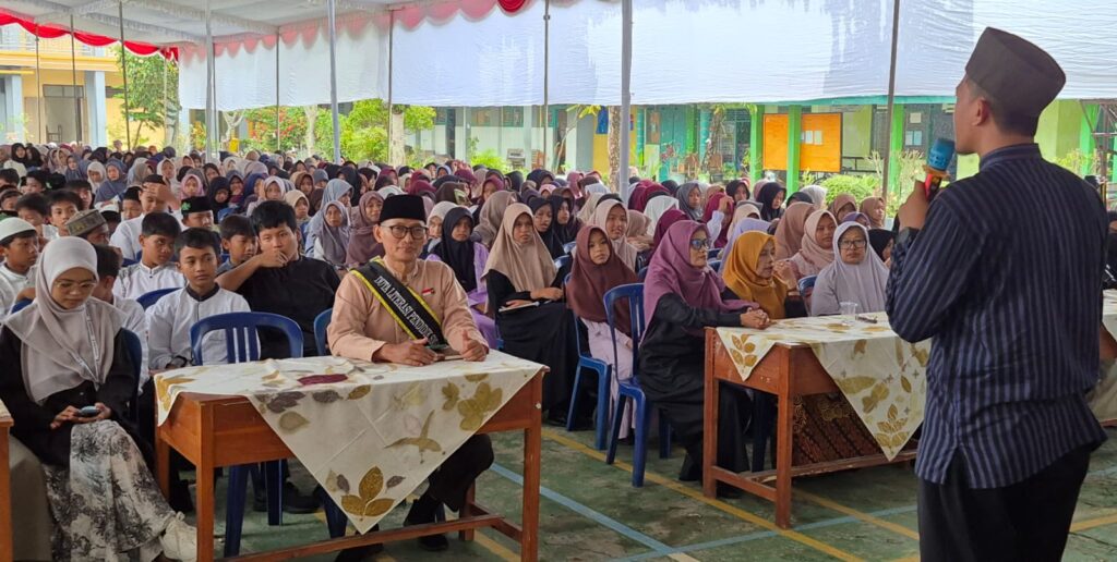 Bersama seluruh siswa kelas VII hingga IX mengikuti acara literasi berupa dongeng inspiratif yang diadakan di halaman SMPN 18, Kamis (23/10/2025).