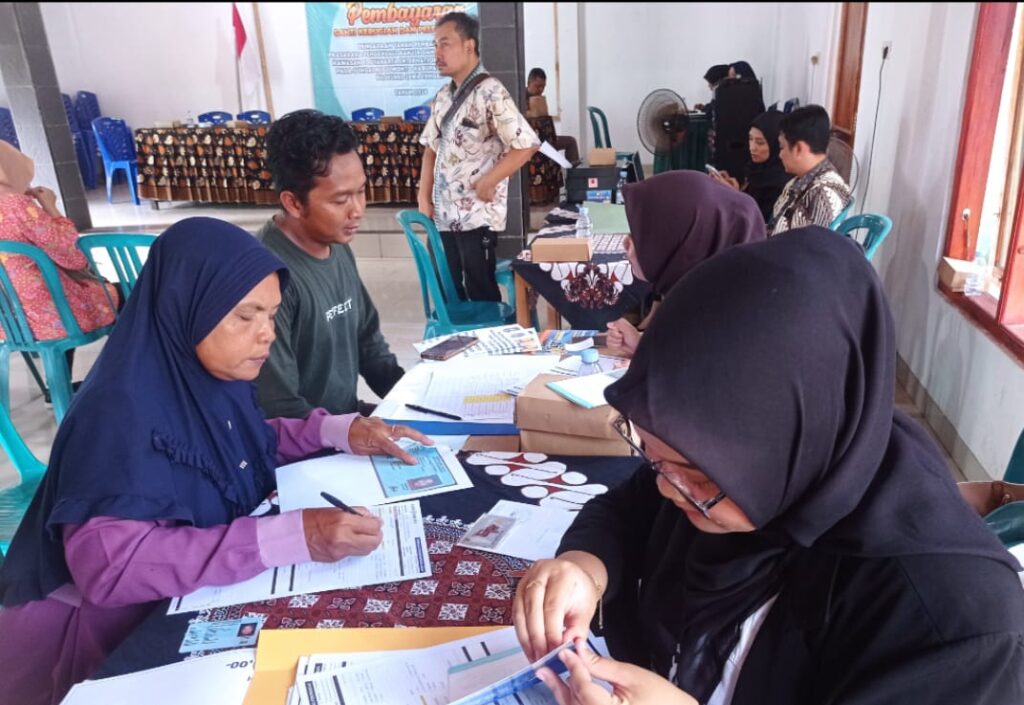 PURWODADI, Suminah, warga Desa Jogoboyo yang kini bekerja menjadi TKW di Arab Saudi menjadi salah satu penerima uang ganti rugi (UGR) Proyek Pengadaan Tanah Pembangunan Prasarana Pengendali Banjir dan Pengamanan Kawasan YIA di Desa Jogoboyo Kecamatan Purwodadi. Proses pelepasan UGR dilakukan di balai Desa Jogoboyo, Jum’at (24/1/2025). Tercatat ada sembilan bidang milik lima orang yang mendapatkan UGR pada kesempatan terakhir ini.