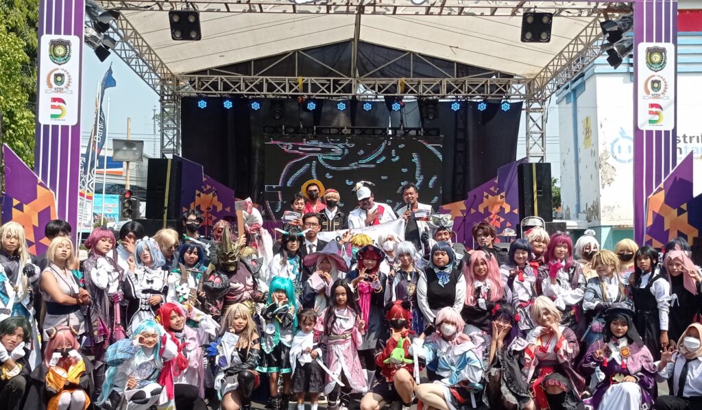 PURWOREJO, Ratusan penggemar cosplay atau kostum tokoh karakter fiksi berkumpul di area Pekan Raya Purworejo (PRP) pada Minggu (22/10) siang. Beragam cosplay yang identik dengan tokoh fiksi Jepang berseliweran di sekitar panggung PRP dan menarik perhatian pengunjung untuk sekedar berfoto atau menyapa.