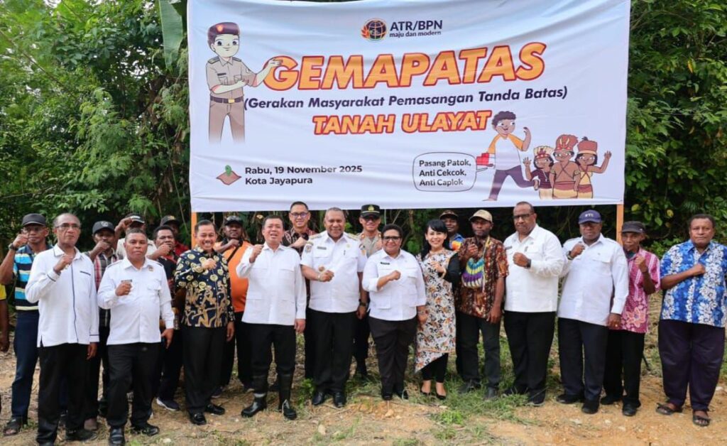 JAYAPURA,-Pelaksanaan Gerakan Masyarakat Pemasangan Tanda Batas (GEMAPATAS) di Skouw Yambe, Distrik Muara Tami, jadi langkah percepatan pendaftaran tanah ulayat di Papua. Menteri Agraria dan Tata Ruang/Kepala Badan Pertanahan Nasional (ATR/BPN), Nusron Wahid, hadir menyaksikan pemasangan patok tanda batas tersebut pada Rabu (19/11/2025), sebagai bagian dari penetapan batas-batas tanah adat sebelum proses administrasi pendaftaran tanah dilakukan.