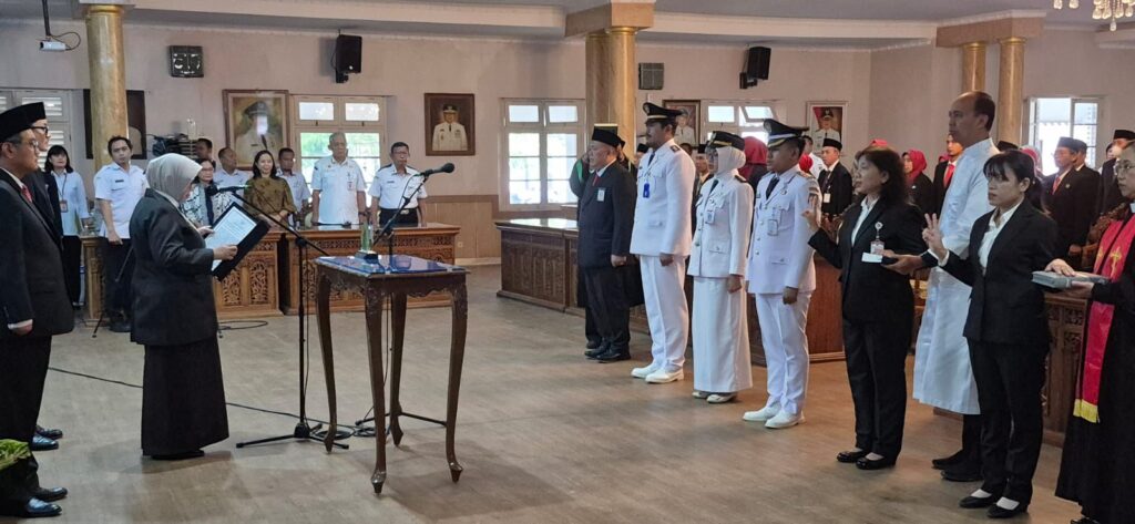 Kepala Inspektorat Ahmad Kurniawan Kadir dan Kepala BKPSDM Agung Wibowo menjadi saksi jalannya pelantikan yang juga dihadiri oleh Wabup Dion Agasi Setiabudi dan seluruh jajaran pimpinan OPD tersebut.