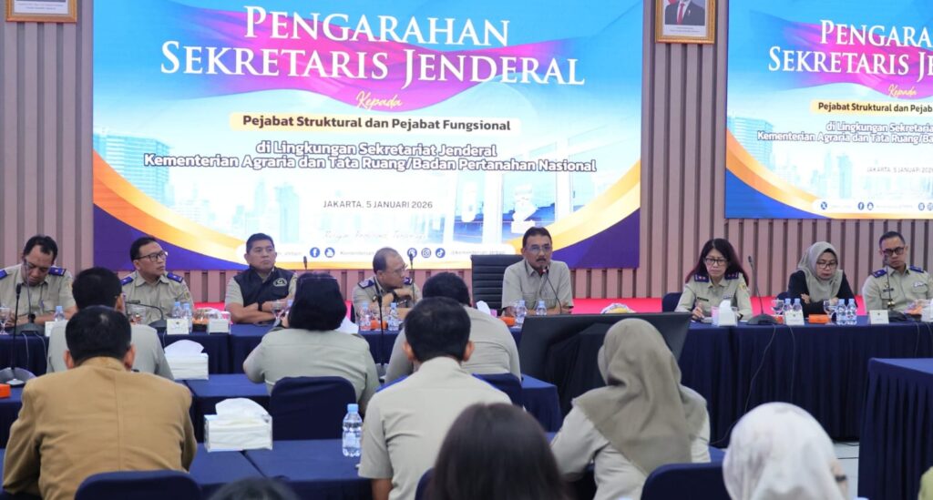 JAKARTA, Menyongsong pelaksanaan program kerja tahun 2026, Sekretariat Jenderal (Setjen) Kementerian Agraria dan Tata Ruang/Badan Pertanahan Nasional (ATR/BPN) menggelar kegiatan Pengarahan Sekretaris Jenderal (Sekjen) bagi Pejabat Struktural dan Fungsional di lingkungan Setjen. Dalam kesempatan tersebut, Sekjen Kementerian ATR/BPN, Dalu Agung Darmawan, mengajak seluruh jajaran untuk memperkuat kerja sama lintas biro demi mendukung pelaksanaan program kementerian secara optimal.