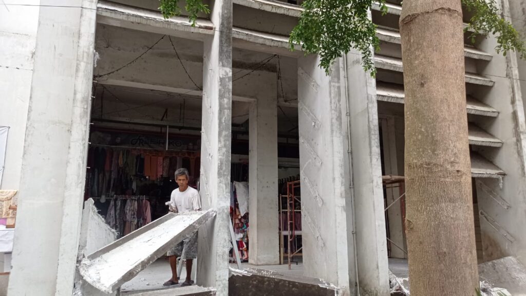 Esok harinya, Jum’at (14/3/2025), pembongkaran pun dilakukan. Pada tahap awal, bagian yang dibongkar terlebih dahulu adalah fasad ram yang berada di sisi selatan pasar. Baru beberapa jam fasad dibongkar, kios yang semula tertutup sudah mulai terlihat dari jalan raya .Termasuk tangga sisi selatan yang selama ini tertutup fasad, kini sudah tampak dari luar.