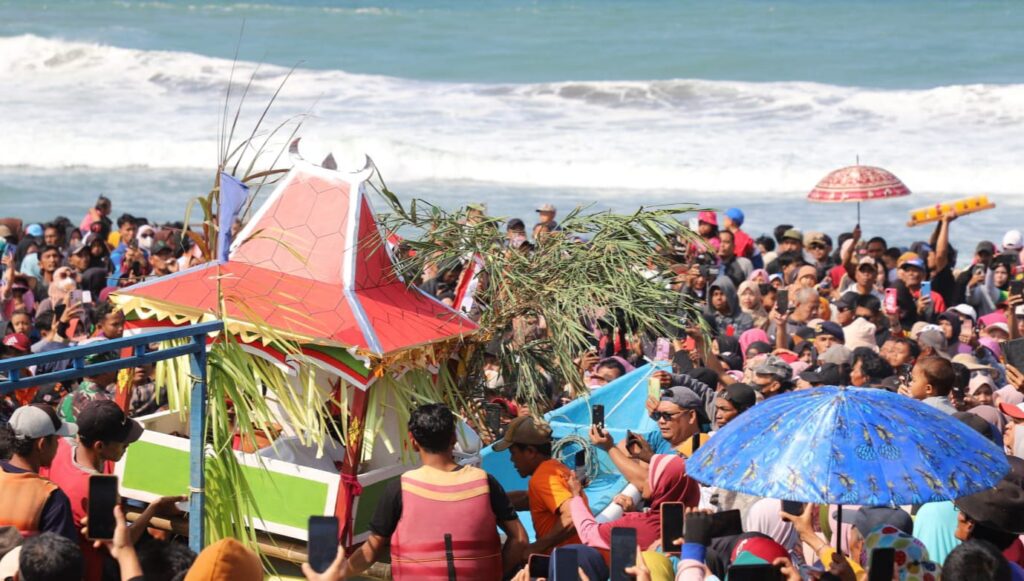 GRABAG, Sedekah Laut di Pantai Genjik Desa Kertojayan Kecamatan Grabag Purworejo yang diadakan pada Minggu (28/7) berlangsung meriah. Dalam acara yang diikuti ribuan warga itu, kepala kambing kendit dilarung ke laut bersama hasil bumi lainnya. Sebelum dilarung, uberampe yang ditata di wadah berbentuk miniatur rumah joglo itu diarak bersama menuju tepian laut.