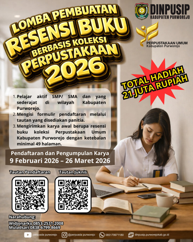 KUTOARJO, Dinas Perpustakaan dan Kearsipan (Dinpusip) Kabupaten Purworejo kembali menggelar Lomba Pembuatan Resensi Buku Berbasis Koleksi Perpustakaan Tahun 2026. Lomba yang dibiayai melalui anggaran Dana Alokasi Khusus Non Fisik (DAK NF) itu, menyediakan total hadiah senilai Rp21 juta.