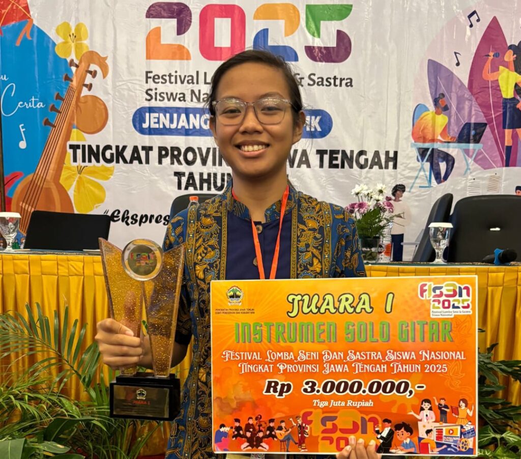 PURWOREJO, Prestasi membanggakan kembali diraih SMAN 1 Purworejo setelah salah satu siswanya, Lovea Finishia Yisyia (XI-E) meraih Juara 1 Tingkat Provinsi Jawa Tengah dalam ajang bergengsi Festival Lomba Seni dan Sastra Siswa Nasional (FLS3N). Atas prestasinya tersebut Lovea akan mewakili Jawa Tengah pada ajang FLS3N Nasional Bidang Lomba Instrumen Solo Gitar.