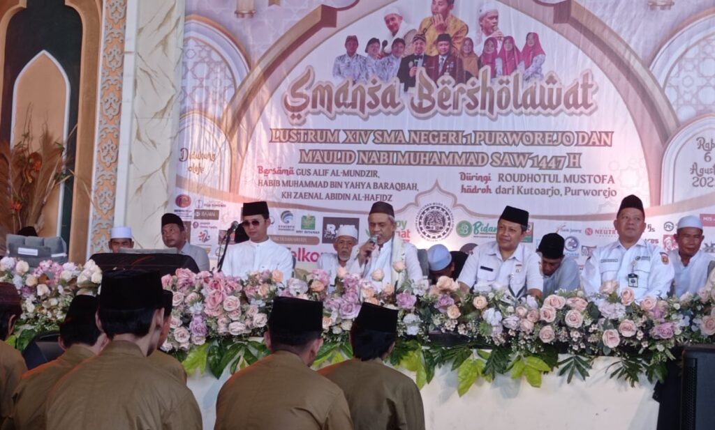 PURWOREJO, Smansa Bersholawat menjadi kegiatan pamungkas rangkaian Lustrum XIV atau ulang tahun ke-70 SMAN 1 Purworejo. Gus Alif al Mundzir (Kudus), Habib Muhammad Bin Yahya Baraqbah (Solo), dan KH Zaenal Abidin al Hafied (Kutoarjo) bergantian memimpin sholawat yang diikuti seluruh siswa, guru, dan karyawan SMAN 1 yang beragama Islam.