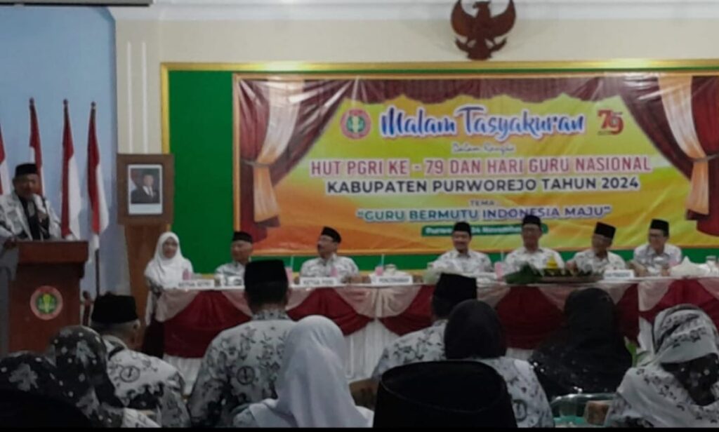PURWOREJO, Tasyakuran digelar untuk memperingati Hari Guru Nasional (HGN) dan HUT ke-79 PGRI pada Minggu (24/11) malam. Tasyakuran di Aula Gedung PGRI itu diselenggarakan oleh PGRI Kabupaten Purworejo, diikuti peserta kurang lebih 100 orang. Meliputi pejabat dari Dinas pendidikan dan Kebudayaan (Dindikbud), Kementerian Agama, Ketua YKGTKS, Ketua Dewan Pendidikan, Ketua IGTKI, dewan penasihat, dewan pakar, pengurus pleno. Juga pengurus organisasi, serta perwakilan pengurus cabang dan cabang khusus.