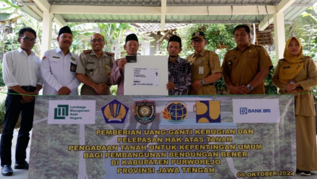 BENER, Satu bidang tanah wakaf yang berada di Desa Wadas Kecamatan Bener dilepas untuk pembangunan Bendungan Bener. Pelepasan hak atas tanah tersebut mendapatkan Uang Ganti Kerugian (UGK) senilai Rp 576.540.030 yang diserahkan pada Selasa (8/10). Penyerahan dilakukan di Serambi Masjid Nurul Huda, dihadiri oleh Pelaksana Pengadaan Tanah (P2T), Asisten 1 Sekda Bidang Kesra Bambang Susilo, Kemenag Kabupaten Purworejo, Badan Wakaf Indonesia (BWI), perbankan,dan forkopincam.