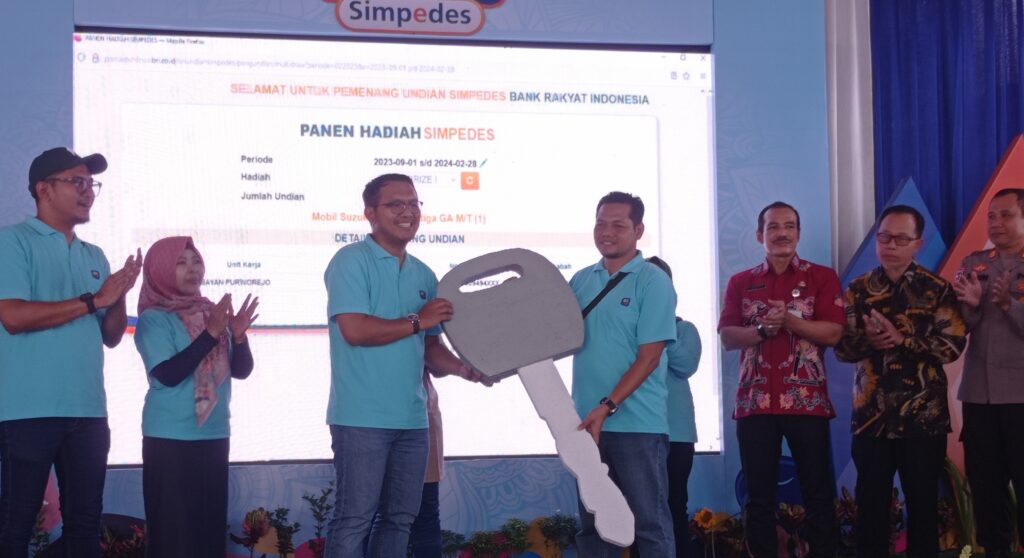 PURWOREJO, Muhamad Sahid, nasabah BRI Unit Bayan beruntung memperoleh hadiah utama mobil Suzuki Ertiga dalam pengundian Panen Hadiah Simpedes BRI Periode 2 Tahun 2023. Pengundian dilakukan di halaman Kantor Cabang (kanca) BRI di Jalan A. Yani pada Sabtu (18/5).