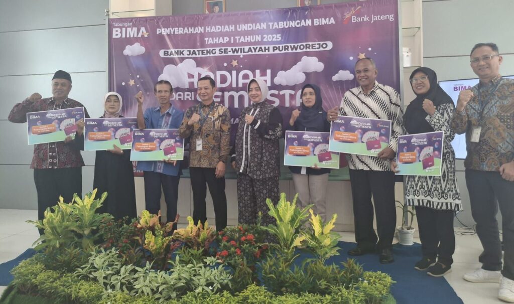 PURWOREJO, Bank Jateng Cabang Purworejo kembali memberikan apresiasi kepada nasabah setianya melalui penyerahan hadiah Undian Tabungan Bima Periode I Tahun 2025. Dalam kesempatan tersebut, dua warga Purworejo berhasil membawa pulang hadiah utama berupa uang tunai Rp150 juta atau masing-masing mendapat Rp75 juta.