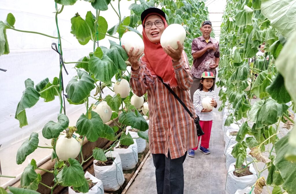 Buah melon jenis Kirani yang siap panen berkulit putih dengan daging berwarna orens dan rasa manis. Pengelola juga menyediakan keranjang dan gunting untuk memudahkan pengunjung yang akan memetik dan membawa melon sebelum ditimbang.